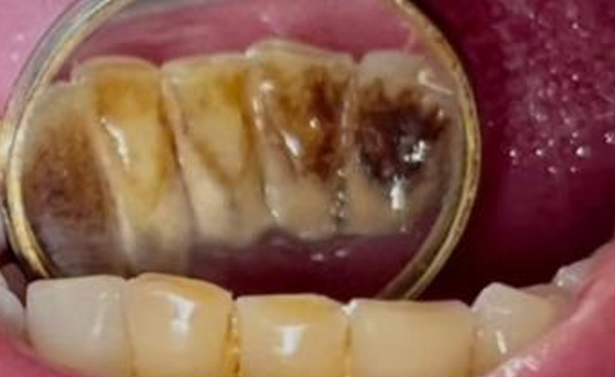 Негативное влияние курения на эпителиий десны клинически проявляется повышенным ороговением (бледный цвет десны), меланозом (пигментация десны), ускорением снижения уровня эпителиального прикрепления (рецессия).